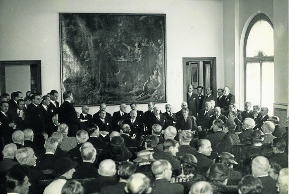 Colegio de España. La ceremonia de la inauguración, en una de las salas del Colegio. Preside M. Lebrun y, entre otros, pronuncian discursos, sucesivamente, D. Blas Cabrera, presidente de la Delegación española; el Sr. Charley, presidente del Consejo de la Universidad de París; el Sr. Honnorat y el embajador, Sr. Cárdenas