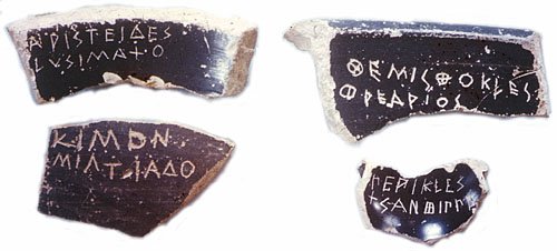 Asi pues, una vez al año, toda la Polis se reunía en el ágora y escribía en estas tejas el nombre de algún político al que consideraban “peligroso”… ¿El castigo?… Ser condenado al ostracismo significaba el destierro durante 10 años.