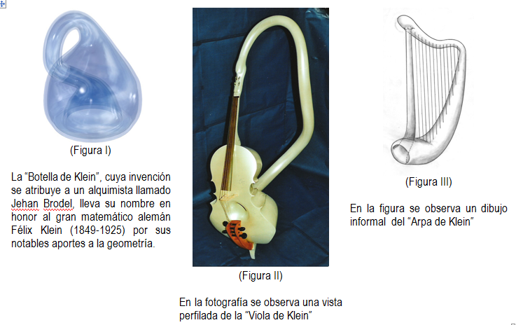 El proyecto se refiere a un nuevo instrumento musical de cuerdas, del tipo experimental, cuya forma básica se genera a partir de una superficie geométrica conocida como “Botella de Klein” (Figura I) la cual se deforma de un modo particular para formar el cuerpo del instrumento. Conceptualmente, Dicho instrumento, denominado en adelante “Viola de Klein” (Figura II), no guarda parentesco alguno con otros instrumentos musicales de cuerdas conocidos, si bien por diversos factores (búsqueda de afinidad acústica y estética, conocimiento previo de las técnicas de ejecución instrumental) evoca, en su realización práctica más representativa, a un instrumento de la familia de las violas. Otra realización práctica podría ser por ejemplo, la que evoque un arpa (Figura III).