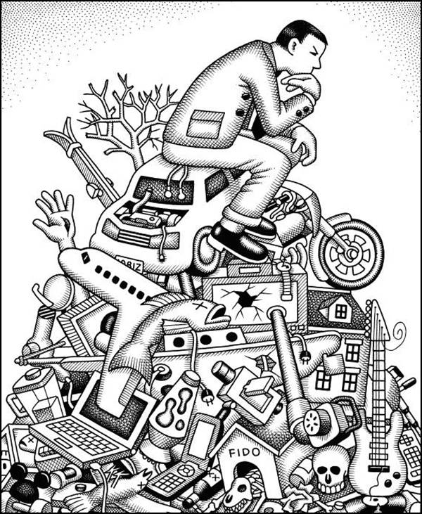 Este estado de cosas es aceptado por las izquierdas: porque no queda otra alternativa a esta aceptación que la de quedar fuera de juego. De aquí el general optimismo de las izquierdas, una vital tentativa de anexarse al nuevo mundo -totalmente distinto de cualquier mundo precedente- creado por la civilización tecnológica. Los izquierdistas van todavía más lejos en esta ilusión (protervos y exitistas como son), atribuyendo a esta nueva forma de historia creada por la cultura tecnológica, una potencialidad milagrosa de rescate y de regeneración. Ellos están convencidos que en este plano diabólico de la burguesía que tiende a reducir a sí misma la totalidad del universo, incluidos los obreros, terminará con la explosión de una entropía constituida así, y la última chispa de la conciencia obrera será capaz, entonces, de hacer resurgir de sus cenizas aquel mundo estallado (por su propia culpa) en una especie de palingenesia (viejo sueño burgués-cristiano de los comunistas no obreros).