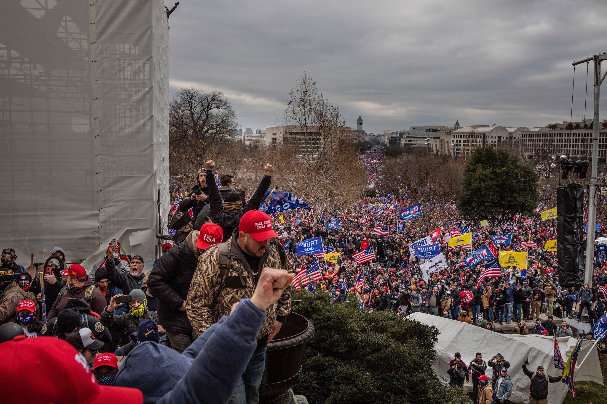 Afuera del Capitolio, la multitud aplaudía mientras los asaltantes entraban en el edificio a las 2:10 p. m.Credit…Ashley Gilbertson/VII para The New York Times