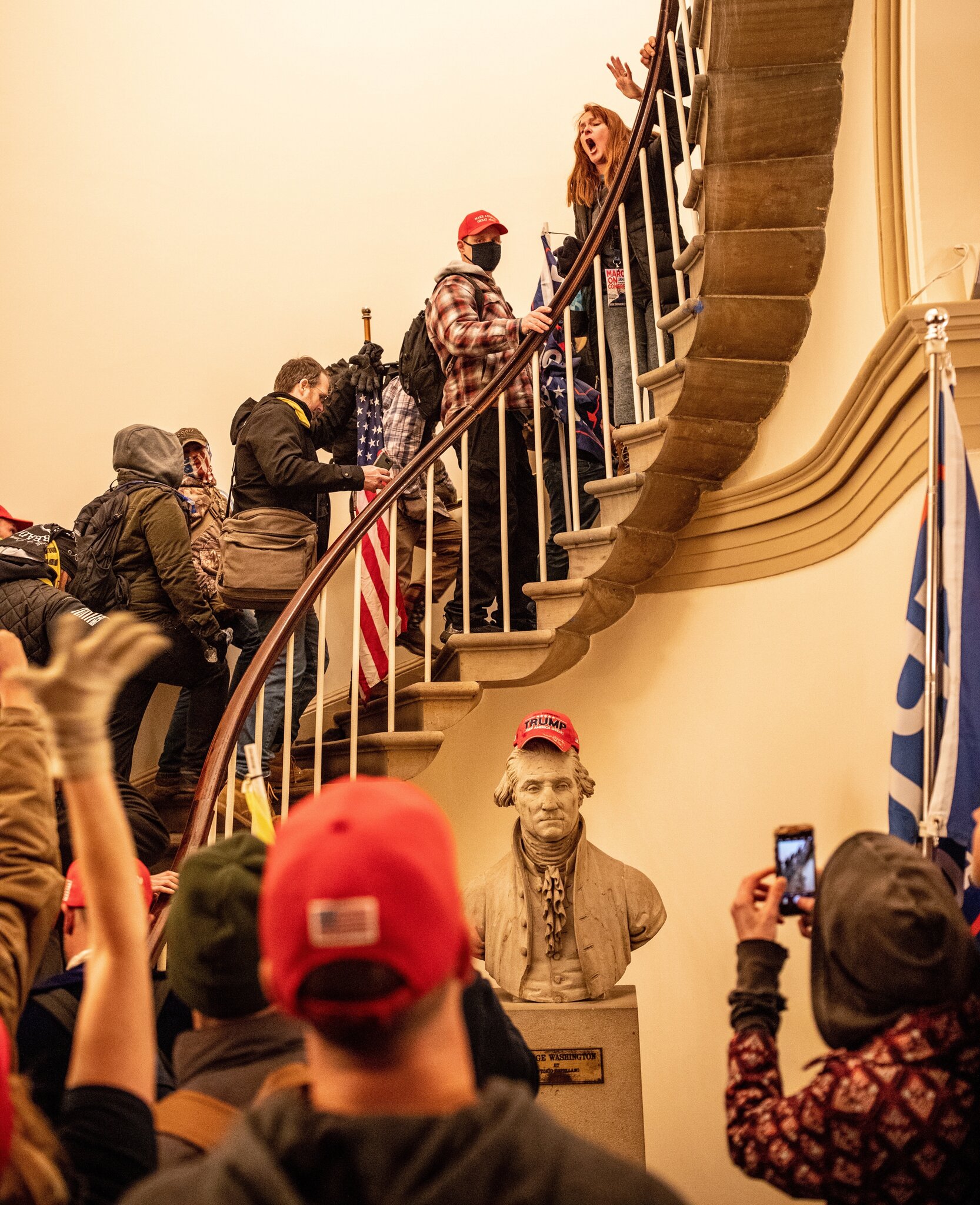 Un busto de George Washington, con una gorra de Trump, mientras los intrusos recorrían el edificio, a las 2:34 p. m.Credit…Ashley Gilbertson para The New York Times