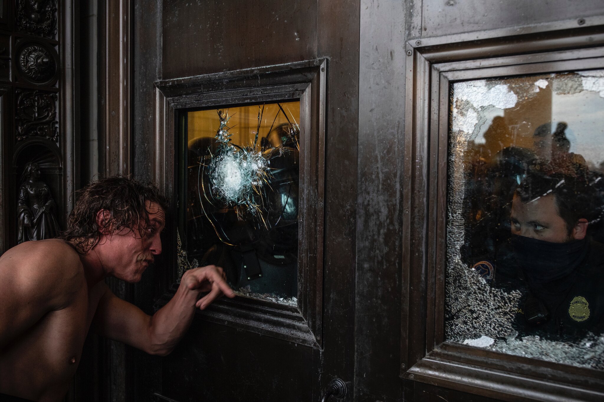 Un camarógrafo de The Daily Caller, un sitio web de derecha, después de ser rociado con gas pimienta durante el caos en el Capitolio, a las 3:45 p. m.Credit…Ashley Gilbertson/VII para The New York Times