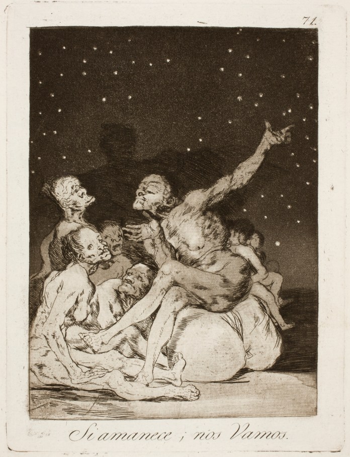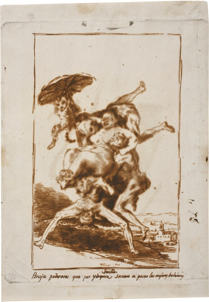 «Bruja poderosa que por ydropica sacan a paseo las mejores boladoras» (Goya, 1797) En este cuadro se crítica tanto la persecución hacia las brujas como la promiscuidad que estaba asociada a las mismas.