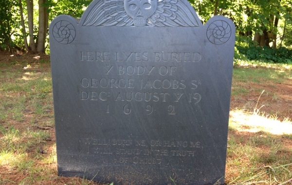 Fotografía de la Tumba de George Jacobs (Anónimo, 2019). Él es la única victima de la caza cuyos restos han sido encontrados, gracias a que sus nietos los recuperaron la noche de su ejecución para poder enterrarlos en la finca familiar. (W. Upham, 1969: 321) En su tumba podemos leer que no importaba lo que hicieran con su cuerpo por que él seguiría siendo inocente y leal a su señor.