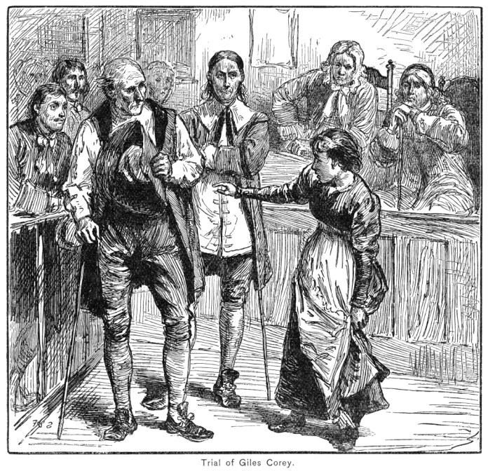 El juicio de Giles Corey (Charles Reinhardt, 1878). Los hombres acusados mostraban un perfil distinto al de las acusadas, pues sobre todo se trataba de personas que manifestaban públicamente su falta de creencia en las acusaciones. Un ejemplo es el caso de Giles Corey que fue perseguido cuando empezó a luchar contra los juicios.