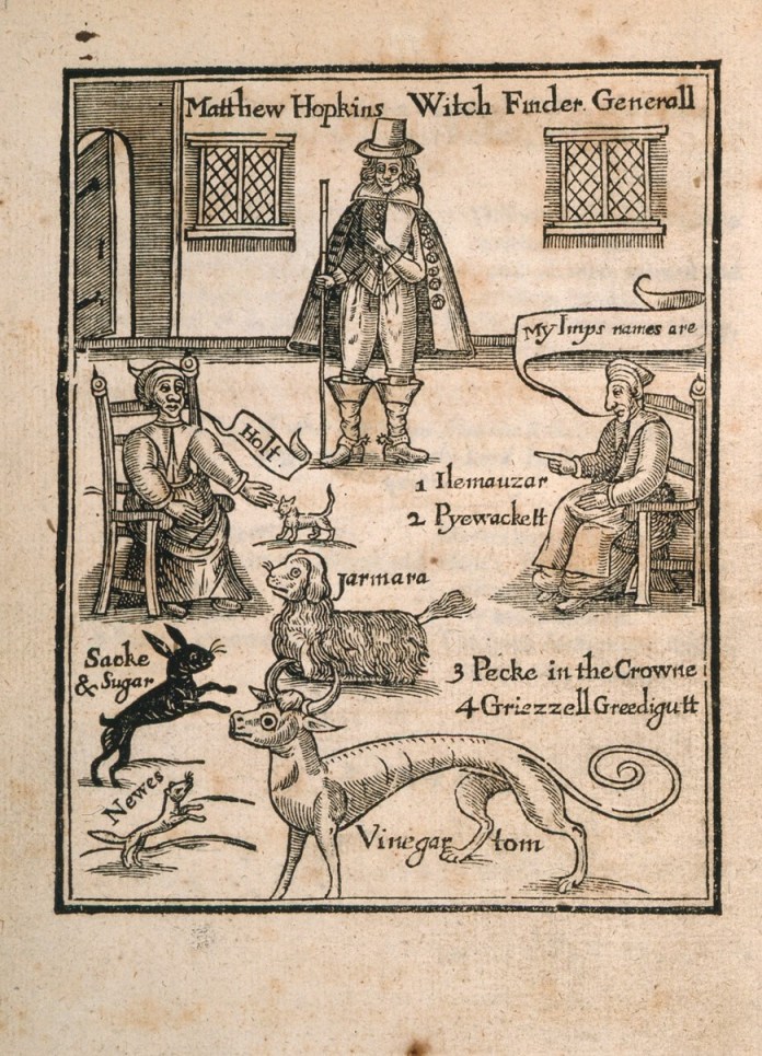The Discovery of Witches (Matthew Hopkins, 1647). Dos brujas muestran sus animales familiares ante Matthew Hopkins en este grabado perteneciente al libro de este dedicado a la caza de brujas.