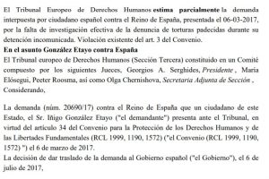 El Tribunal afirma en su sentencia que González Etayo describió «de manera precisa y circunstancial los malos tratos de los que afirmó haber sido víctima durante su incomunicación cuando presentó una denuncia sobre los mismos ante el juez de guardia de Pamplona así como ante el juez central de instrucción a la Audiencia Nacional».