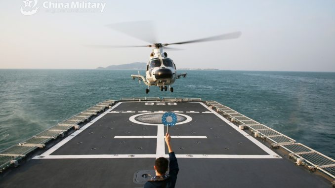 Un helicóptero a bordo de un barco adjunto a una flotilla de fragatas del Ejército Popular de Liberación aterriza en la cubierta de vuelo de la fragata de misiles guiados Wuzhou (Hull 626) bajo la guía de un soldado durante una operación de entrenamiento de extinción de incendios marítimos a principios de diciembre de 2021. Foto: Ejército Popular de Liberación