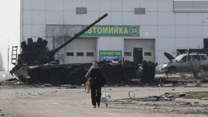 Imagen del 25 de marzo de 2022 de una mujer caminando cerca de los restos de un tanque, en Mariúpol, una ciudad portuaria en Donetsk. (Xinhua/Victor)