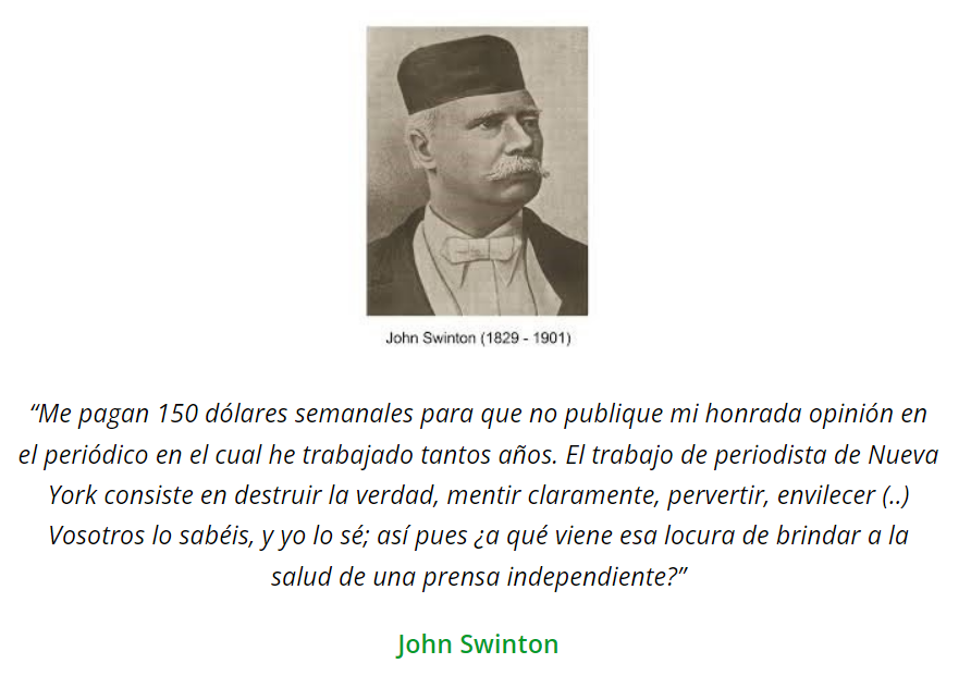 “Hoy en día no puede creerse nada de lo que publican los periódicos. La verdad misma se hace sospechosa cuando aparece en ese vehículo contaminado. Sólo quienes están en situación de confrontar los hechos que conocen con las mentiras del día pueden saber hasta dónde llega ese estado de desinformación. Un hombre que jamás mire un periódico estará mejor informado que quienes los leen, por lo mismo que quien no sabe nada está más cerca de la verdad que quien tiene la mente repleta de falsedades y errores. La difamación se está convirtiendo en algo necesario para la vida, hasta el punto de que no puede digerirse una taza de té por la mañana o por la noche sin este estimulante. Hasta aquellos que no creen esas abominaciones las leen complacidos a sus oyentes, mostrando, en lugar del horror y la indignación que deberían abrumar a una mente virtuosa, un placer secreto por la posibilidad de que alguien llegara a creerlas, aunque ellos no las crean. Parece que no se percatan de que el verdadero autor no es el que imprime, sino el que paga”.