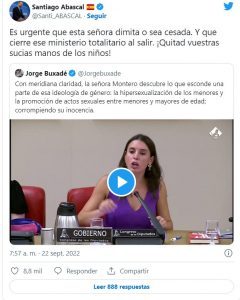 El presidente de Vox, Santiago Abascal, ha salido al paso de estas disparatadas declaraciones pidiendo la dimisión o el cese de Irene Montero y el cierre de «ese ministerio totalitario». Termina el tuit diciendo «¡Quitad vuestras sucias manos de los niños!».