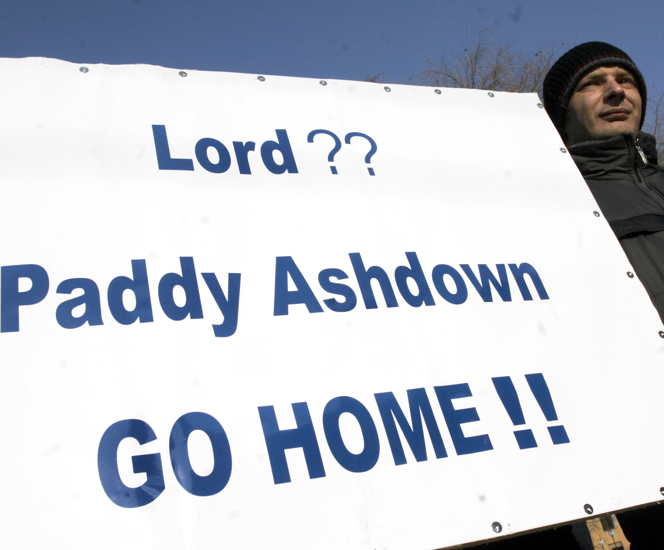 Un policía bosnio descertificado por “no cumplir con los estándares de la ONU” sostiene una pancarta durante una protesta frente a la Oficina del Alto Representante Paddy Ashdown en Sarajevo, 2006. Hidajet Delic | AP