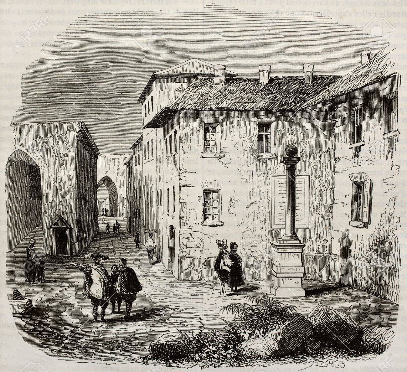 Infamous column old view, Milan, Italy (then destroyed in 1778). Created by Girardet, published on Magasin Pittoresque, Paris, 1843