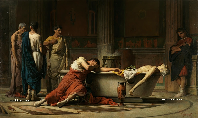 *La imagen es el óleo de Manuel Domínguez Sánchez: «Séneca, después de abrirse las venas, se mete en un baño y sus amigos, poseídos de dolor, juran odio a Nerón que decretó la muerte de su maestro», que alberga el Museo del Prado de Madrid.