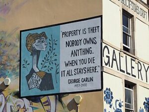Mural de Bristol: «La propiedad es un robo, nadie posee algo. Cuando mueras todo se quedará aquí» George Carlin (1937-2008).