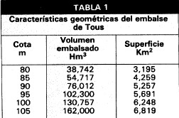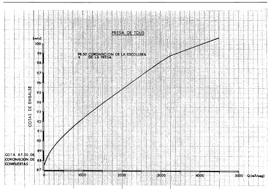 Hasta ese momento se puede determinar directamente los caudales de entrada a TOUS en función de la evolución de los niveles en el embalse anotada por Jesús González Marín. Para ello se necesitan la ley de capacidad del vaso a distintas alturas y la que relaciona los niveles de embalse con tos caudales de salida estando las compuertas cerradas, ya que es sabido que estas no pudieron abrirse. Esta última ley se obtuvo sobre modelo reducido en el Laboratorio de Hidráulica del CEDEX y se recoge en la figura 1. La tabla 1 presenta la ley de capacidad y la tabla 2 los datos de González Marín.