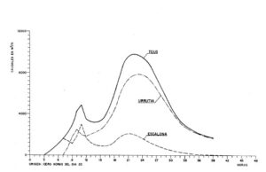 Se da también otra circunstancia, que facilita el análisis, cual es la existencia de registros de lluvia en diferentes intervalos a partir de las 9 h. del 20 en la estaciòn de Casas del Barón, situada en la cuenca del Escalona (ver testimonio 2), lo cual ayuda a la estimación del hidrograma de ese río carente de otras informaciones en las horas de la tarde.