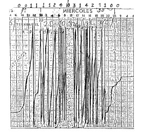 En las fig 4 se reproduce la banda del pluviógrafo y en la n o 5 la traducción que se facilitó de la misma, y aparece en la práctica totalidad de los informes técnicos sobre esta crecida. Si bien en líneas generales la traducción es correcta, se observan algunos errores con posibles consecuencias prácticas a ciertos efectos. A pesar de la confusión que crea la acumulación de trazos en las horas de fuerte intensidad del aguacero, se puede deducir de la observación de la banda que en la fig. 5 la lluvia ha sido infravalorada entre las 6 y las 7 h. del día 20 y sobrevalorada entre las 1 1 y las 12 hora de ese mismo día.