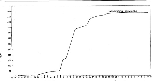 Día 19 a 20 horas empieza a llover suave hasta las 22,30 h. en que empieza fuerte; a la 1 h. del día 20 se miden 200 litros/m. 2, a las 6,30 horas empieza fortísimo hasta las 8, 30 en que estaba rebosando; se deja vacío y ya no se puede medir hasta el día 23 a las 8 horas en que estaba rebosando.