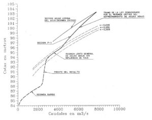 Se llama la atención sobre la impresionante magnitud de esa lámina de agua que supera los 20 m. de calado y excede en unos 9 m. la coronación de los de por sí elevados cajeros del encauzamiento. La hora de presentación del máximo fue hacia las 24 h., es decir 5 h. posterior al desmoronamiento de la presa, cuando el embalse ya estaba bajo la cota 81 y muy por debajo de la lámina de Urrutia (datos de González Marín) y, por tanto no podría influenciarla.