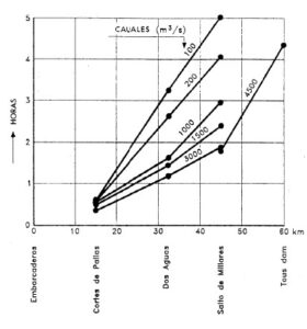 No obstante, apoyándose en lo posible en dichos datos y en la referencia que proporciona el hidrograma de la Presa de Embarcaderos, se han dibujado unos hidrogramas estimados en dichas Centrales de Cortes y Juan de Urrutia (Millares), que son los que figuran en el gráfico adjunto.