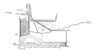 En el modelo se observa (rectificando ligeramente la estimación teórica) que para el caudal máximo el nivel ‘en el cauce es similar al del interior de la central y, desde luego, inferior en aproximadamente 2,80 m. al nivel máximo que por efecto de parada y por agitación se alcanza en el frente de la central.