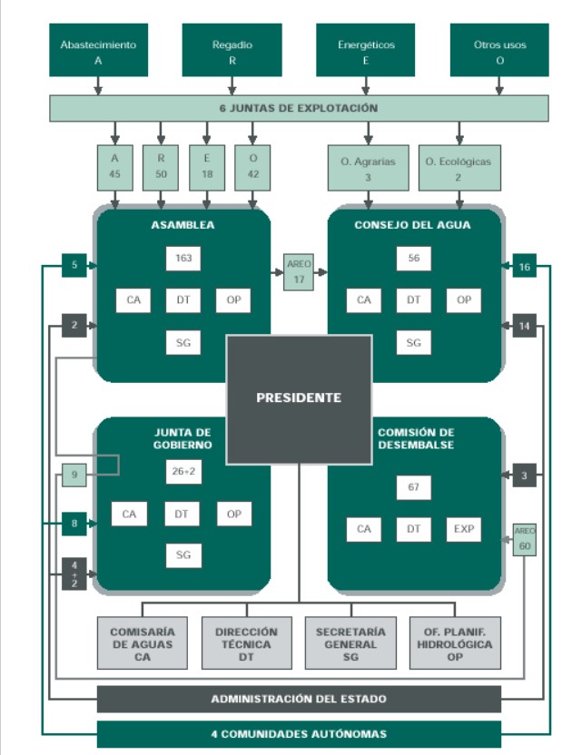 Usuarios del Agua: Se incorpora un número variable de representantes de los usuarios afectados por el abastecimiento, regadío y uso hidroeléctrico o industrial. Estos usuarios son designados por la Asamblea de Usuarios o, si se trata de una cuenca gestionada por un gobierno autonómico, por la Junta de Gobierno.