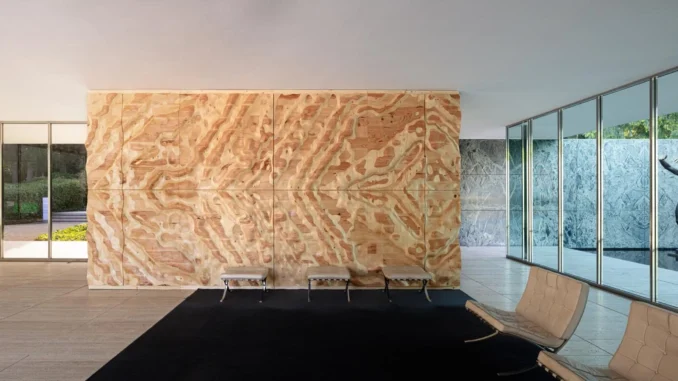 ¿Es un fraude, una falsificación, un fake? No, no lo es. El pabellón fue construido en 1929 como espacio para la inauguración oficial de la Exposición y con el fin de recibir autoridades como el rey o los munícipes de la época. Luego se desmontó. Quedaron los planos y muchos estudios y fotografías sobre y del edificio que inspirarían una multitud de construcciones similares en los siglos XX y XXI. Su actual reproducción clónica es más bien un documento en vivo o, si se prefiere, un pabellón de Mies renacido, pero no es una falsificación (un fake) porque el original de Mies sólo existió en los planos y no le daban derecho sobre la propiedad. En este caso podemos usar la palabra “fraude” sólo en un sentido humorístico, porque se supone que todos los visitantes saben que es una construcción nueva y no el original, como se explica adecuadamente en los catálogos turísticos oficiales.