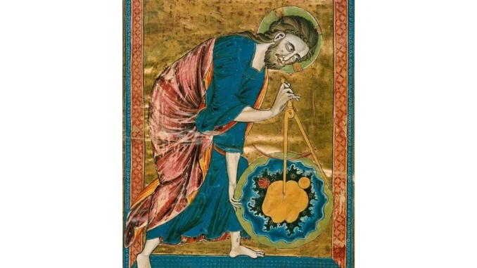 Como tantas otras veces, la representación simbólica precedió a la realidad política, la intuición a la ejecución política. Parece como si el espíritu humano creara un vacío de poderoso deseo que luego había que llenar con materia terrestre. A esa necesidad de un espacio monumental se unió una idea en verdad visionaria, la de que Dios era luz. O, dicho de otro modo, que la casa de Dios entonces existente, la románica, era oscura y empobrecedora, en tanto que Dios y el rey de Francia exigían otro orden simbólico, una casa y un espacio a su medida y esa medida, pensó Suger, era la luminosidad radiante. Sin duda Suger tenía presente el símbolo de Dios como gran arquitecto (Ill. 15 El gran arquitecto)