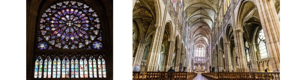 El proceso de invención tuvo tres etapas. En la primera, rehízo la fachada occidental, es decir, la principal, que quedaría cumplida, con dos torres y tres puertas, en 1137. Allí puso el primer rosetón perfecto que ilumina las capillas superiores (Ill. 17 transepto S Denis rosetón), aunque el primero de la historia puede que fuera el de St. Etienne de Beauvais, menos perfecto y difundido. El cuerpo de San Dionisio, que reposaba en la cripta, subió hasta el centro del transepto cubierto de joyas y relicarios de oro y plata (Duby, 127). La segunda etapa la ocuparon las tres naves de la planta baja, todas cubiertas por bóvedas de crucería y terminadas en 1140. Y la tercera (la más importante) fue la cabecera con doble girola y nueve capillas radiales. Allí aparecen los dos primeros grandes ventanales con vidrieras emplomadas que iluminan el altar (Ill. 18 Denis nave central).