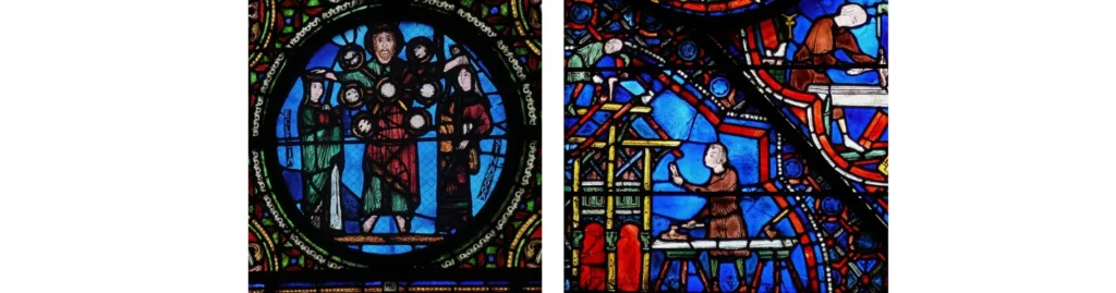 Las primeras fueron simples círculos, en ocasiones con juegos de implicación mutua (Ill. 19 Saint Denis. Alegoría de San Pablo, s.XII). En su desarrollo a lo largo del siglo XIII irían apareciendo imágenes alejadas ya de la historia sagrada o con vidas de santos (que antes no existían) las cuales marcaban el carácter local y patronal de la ciudad, pero lo más sintomático fueron las imágenes del trabajo de los gremios cívicos que pagaban los vidrios (Ill. 20 carpinteros). En la catedral estaban representados todos los habitantes de la ciudad, los ricos y los pobres, los poderosos y los más débiles. Aquel monumento, aquel espacio hermoso, majestuoso, suntuoso, era suyo.