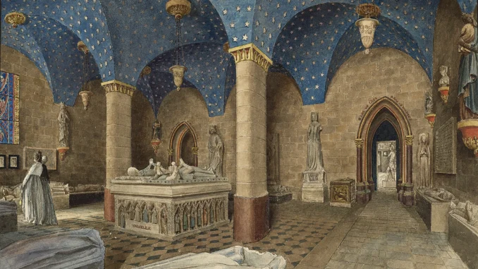 Una Instrucción de la Asamblea que se publicó en marzo de 1794, declaraba que “el propietario y conservador del patrimonio nacional es el pueblo de Francia”. Desde 1791, consciente del vandalismo que estaba llevando a la ruina todas las obras de arte francesas, Alexandre Lenoir había comenzado a almacenar cuanto pudo salvar de la destrucción en un convento desafectado llamado “de los Pequeños Agustinos”, lo que hoy es la Ecole des Beaux Arts, en la calle Bonaparte (Il. 63 Monuments de France). La Instrucción de marzo fue un eficaz salvavidas y el almacén se convirtió en el primer Museo de los Monumentos de Francia. Entre otras muchas maravillas aún pudo amparar, gracias a su incesante actividad, algunas de las tumbas reales, verdaderamente prodigiosas, que hoy, tras su devolución, pueden de nuevo contemplarse en Saint-Denis (Il. 64 Tumbas reales).