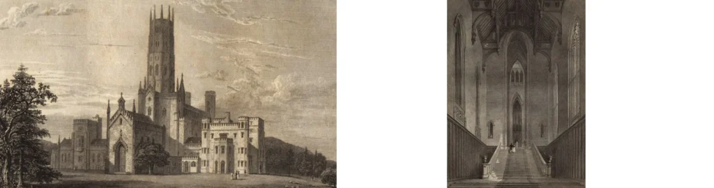 El primer gran edificio neogótico construido de arriba abajo, no fue sino otra fantasía literaria, la Abadía de Fonthill (Il.46 y 47 Fonthill), un capricho edificado por el excéntrico millonario William Beckford, como residencia campestre y para fiestas. Comenzó a elevarse en 1807, pero en 1825 se derrumbó la altísima torre y en la actualidad apenas quedan cuatro piedras. Era un mero escenario romántico, muy apropiado para las ensoñaciones del autor de la novela Vathek, un disparate que aún se reedita y lee. Perdonen el chisme, pero uno de los descendientes de Beckford ha sido el Rey Rainiero III de Mónaco, marido de Grace Kelly, monarca neogótico donde los haya y fascinado, como su antepasado, por los sueños en Technicolor.