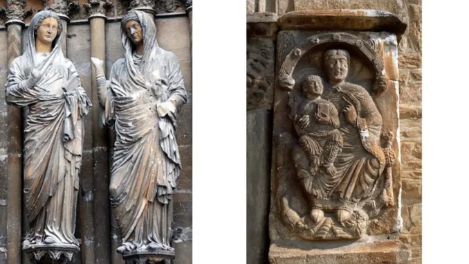 Es por estas fechas de los siglos XII y XIII, cuando la madre de Jesús cambia su figura, de la típicamente románica como robusta matrona sentada en el trono con su hijo sobre las rodillas (Ill. 27 Virgen románica), por la de una doncella en pie, apenas salida de la adolescencia, y que parece danzar con el niño sostenido en los brazos, como la de Notre-Dame de 1260 en la que el niño fue destruido por las hordas revolucionarias.