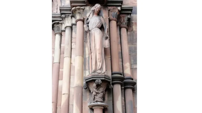 Otra invención de Suger fue la liberación de las esculturas, las cuales abandonaron el muro y se cobijaron bajo su propio espacio, a veces en forma de hornacina. Al poco tiempo, en Chartres, Reims y luego en Estrasburgo, aparecerán maravillosas obras maestras de la escultura, como las de la fachada occidental de Chartres o las de Estrasburgo (Ill. 25 Sinagoga de Estrasburgo y pórtico de 26 Reims). Las prodigiosas estatuas-columnas de Chartres datan de 1145 y aún dependen del espacio arquitectónico, las de Estrasburgo y las de Reims, con su propio espacio, anuncian ya el rejuvenecimiento renacentista de la figura de la virgen María.