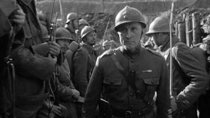 En esta película no existe el arquetipo del héroe, ni el del vencedor, tampoco hay un resquicio de esperanza. El patriotismo se erige como un mal que arrastra a la barbarie, y los jefes militares se perfilan como hombres de despacho manejando a su antojo a miles de hombres “carne de cañón” (nunca mejor dicho). El general Boulard (Adolph Menjou) es un auténtico cobarde que manda fusilar azarosamente a tres pobres hombres a quienes acusa de haber tenido miedo frente al enemigo. Y lo hace como un mero juego, como un escarmiento, dice. En un plano diametralmente opuesto se encuentra el coronel Dax, un maravilloso Kirk Douglas justo, aunque no sea un virtuoso ni un alma cándida. Pero su lucha para salvar la vida de sus hombres como abogado en el consejo de guerra es la lucha de David contra Goliat, sólo que en este caso gana Goliat pues el juicio es un mero teatro, una burla donde no existe auténtica justicia.