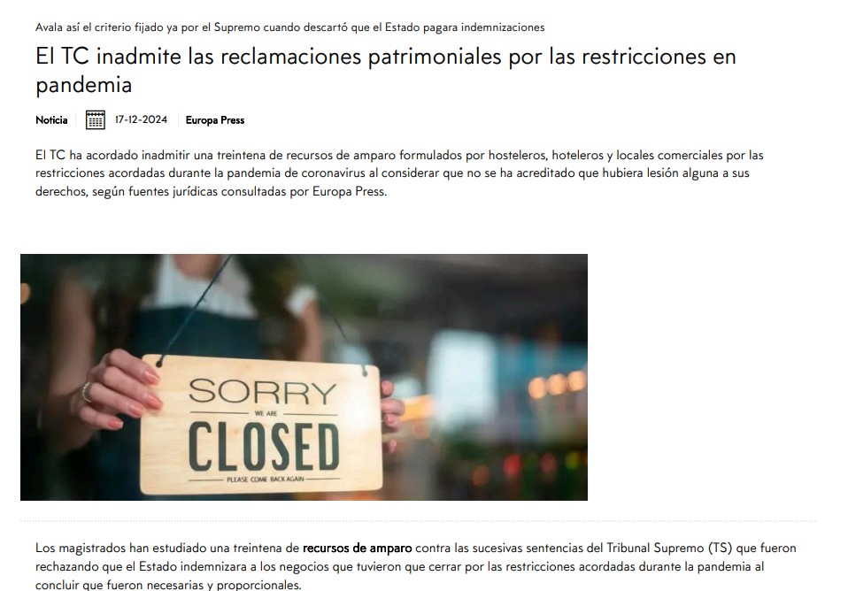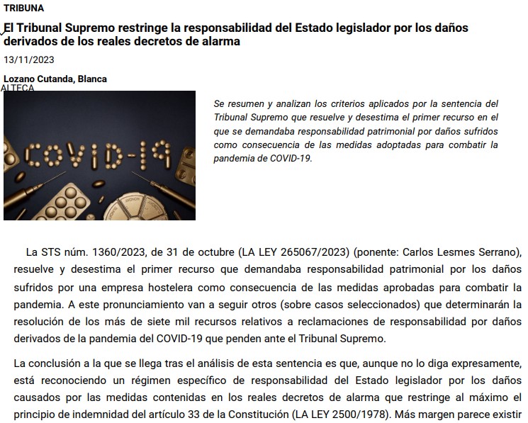 Hemos de añadir también una cuestión fundamental: El Tribunal Supremo, mediante la sentencia n.º 1360/2023, de 31 de octubre, trató de asestar un golpe decisivo a las reclamaciones por daños patrimoniales derivados de los reales decretos del estado de alarma. Aunque aprobó un recurso contra una empresa hostelera, su fallo marca un precedente claro: la vía de la responsabilidad patrimonial del Estado-legislador queda prácticamente clausurada.
