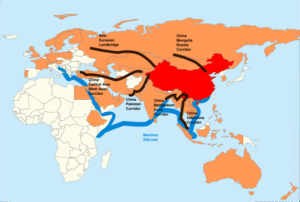 La Iniciativa Franja y Ruta propuesta con China en rojo, los miembros del Banco Asiático de Inversión en Infraestructura en naranja, y los corredores propuestos en negro (Franja) y azul (Ruta).
