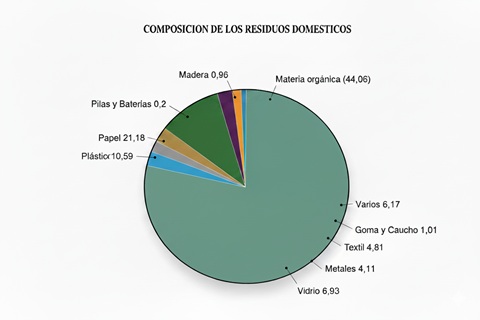El gráfico ilustra la distribución porcentual de los diferentes tipos de residuos que componen la basura doméstica. Los datos reflejan que la materia orgánica constituye la fracción más grande, representando un 44,06% del total, lo que subraya su potencial para el compostaje y la reducción del volumen de desechos. El papel es el segundo componente más significativo, con un 21,18% , destacando la importancia de su reciclaje para la conservación de recursos forestales.