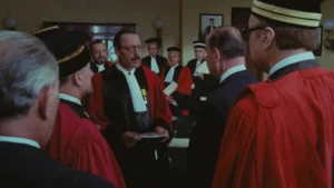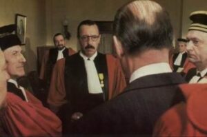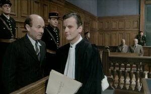 Costa-Gavras, como ya he dicho, es un gran director. Hay una escena en la que el oficial de enlace jurídico alemán contempla con estupefacción no exenta de cierta sorna, a los franceses anunciándole que se va a crear esa sección especial, que se va a juzgar y condenar a esos «culpables«. Y que, como no se ha realizado ningún arresto, se juzgará a gentes que ya están en prisión, aplicándoles una ley sumaria y retroactiva. El oficial alemán no da crédito.