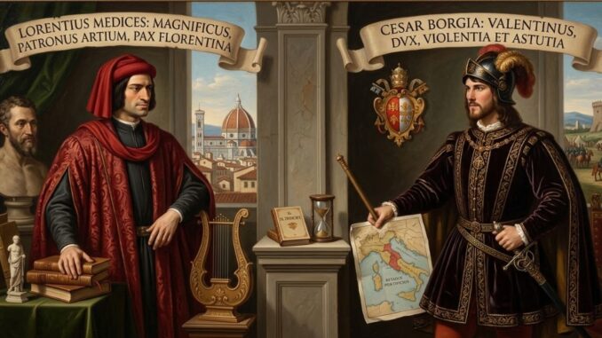 Lorenzo de Medici (el Magnífico, 1449-1492) y César Borgia (1475-1507) fueron figuras clave del Renacimiento italiano, representando modelos opuestos de poder: la diplomacia y el mecenazgo cultural florentino frente a la ambición militar y el nepotismo «maquiavélico» de los Estados Pontificios.